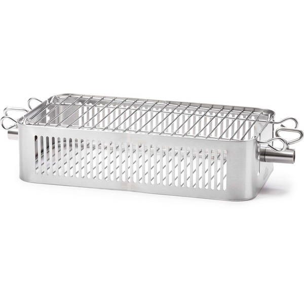 Dieser Drehspieß-Korb aus Edelstahl verfügt über ein 3-fach in der Höhe verstellbares Gitter zum Verschließen und wird mit zwei Feststellschrauben am Drehspieß montiert. Damit grillen Sie Fisch, Gemüse, Meeresfrüchte am Drehspieß