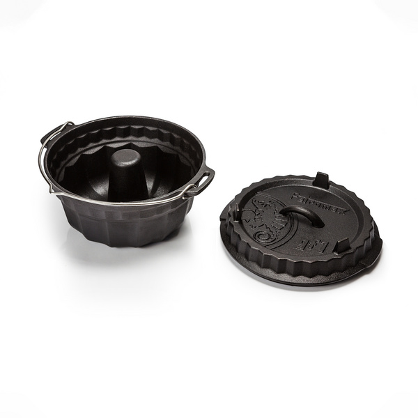 Die Gusseisen-Form zum Backen von Gugelhupfkuchen ( Ø 23 cm) und Tortenböden (Ø22 cm) im Deckel ist sowohl für den Backofen als auch für offenes Feuer geeignet. Der multifunktionale Gardeckel besitzt eine Tortenbodenform auf der Innenseite und Füße zum Aufstellen auf der Außenseite. eine einfache handhabung wird dank eines Tragehenkels gewährleistet.